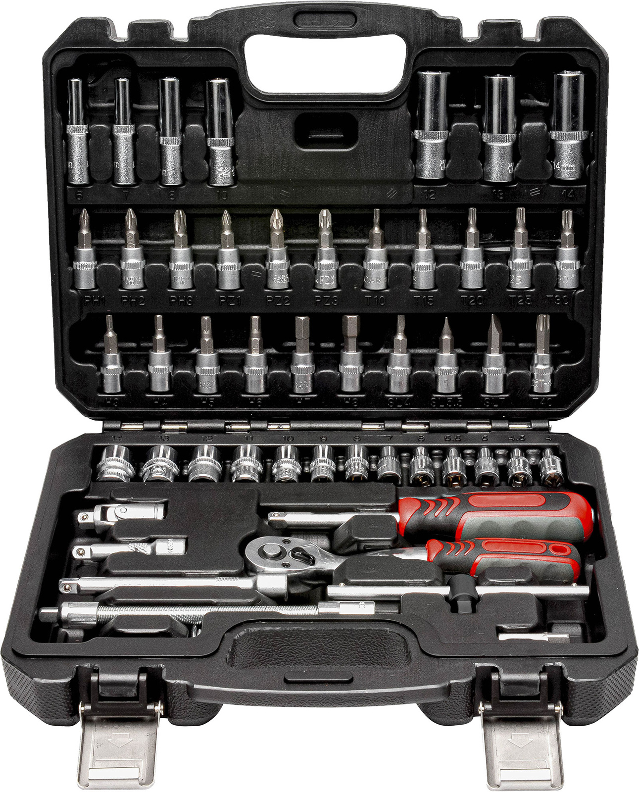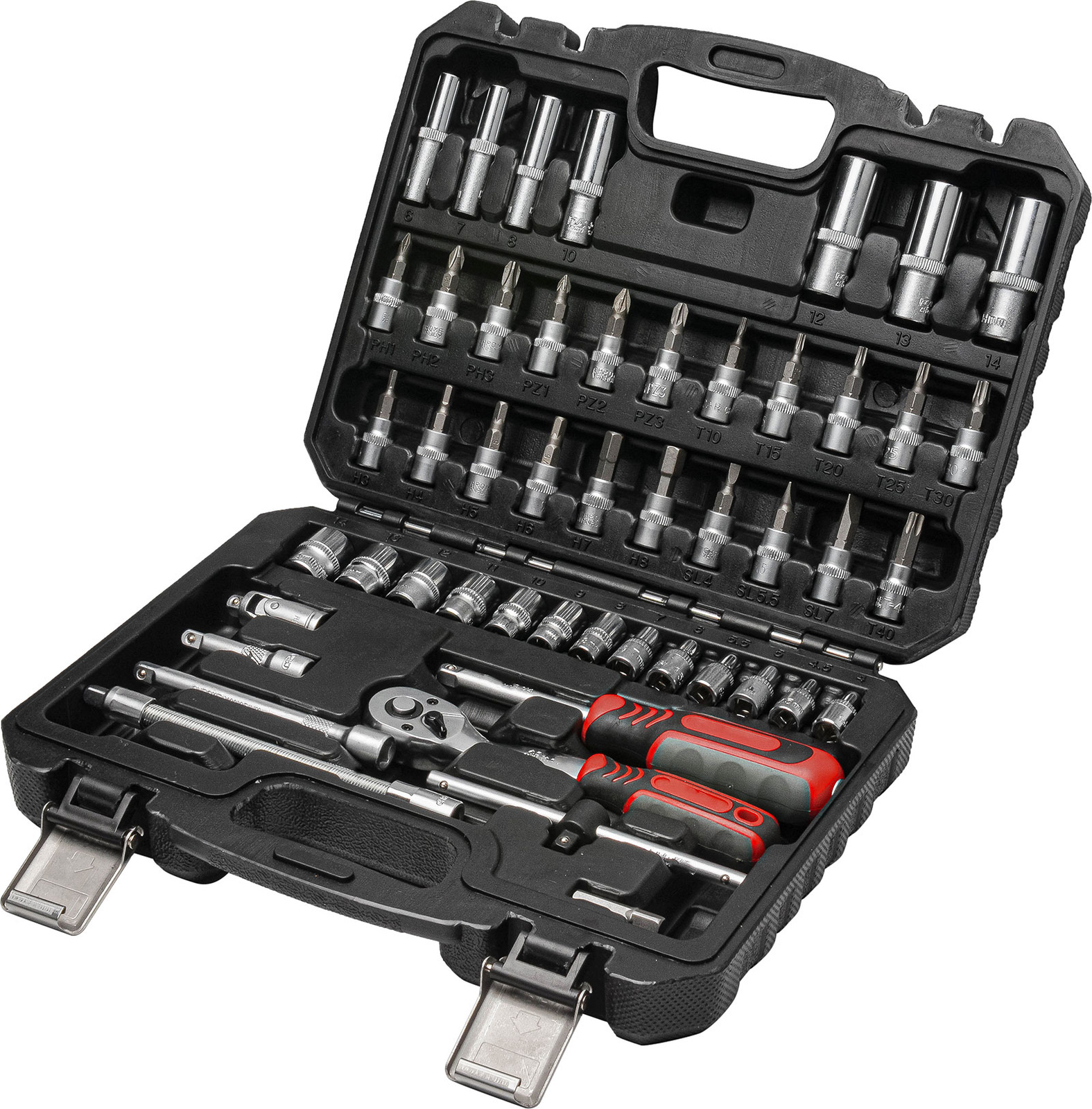 Zestaw 53 szt. narzędzi 1/4" obejmuje nasadki, końcówki wkrętakowe, grzechotkę oraz klucze imbusowe, które gwarantują szeroki zakres zastosowań. Wysokiej jakości materiały, takie jak stal CRV 50BV30, CRMO 440 oraz CRMO 6150, zapewniają wyjątkową wytrzymałość narzędzi. Zestaw